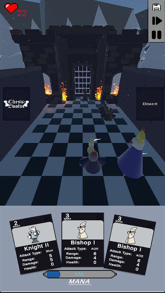 Chess: Evolve is a roguelite tower-defense game where you deploy chess pieces as units and defend your King from waves of enemies. Each run gives you a random set of piece cards. Drag to place them on the board, or sacrifice cards to gain mana and redraw!